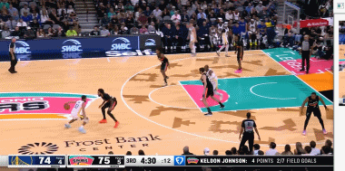 第三节比赛开始后,库里开始火力全开。他先是借助掩护命中三分,随后得到空位机会三分再次出手命中。这还没完,库里期间多次造成外线犯规命中罚球,在本节中段,库里追身三分再次命中,帮助勇士队完成反超!随后库里两次中投得手,单节7投5中,其中三分球5中3,罚球9中9独得22分,带领勇士队最多领先达到10分!
